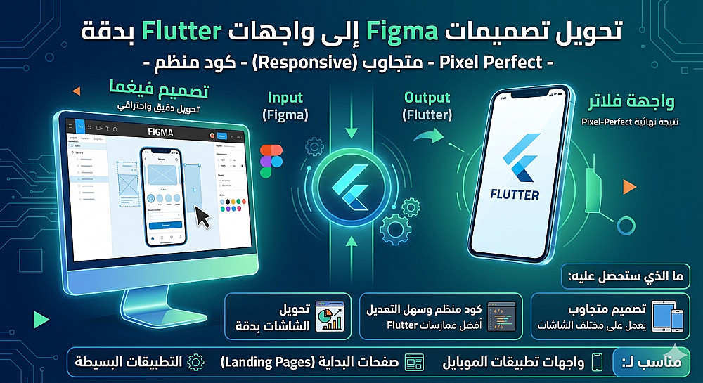 أقوم بتحويل تصاميم Figma الخاصة بك إلى أكواد Flutter نظيفة وعصرية، مع الالتزام التام بتفاصيل التصميم وأحجام العناصر لضمان تجربة مستخدم ممتازة.