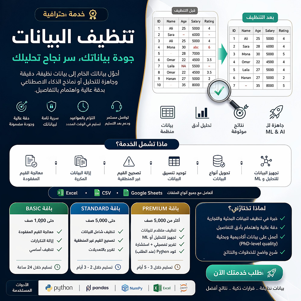 أقدم خدمة احترافية لتنظيف ومعالجة البيانات (Data Cleaning) بهدف تحسين جودة البيانات وجعلها جاهزة للتحليل أو نماذج التعلم الآلي.