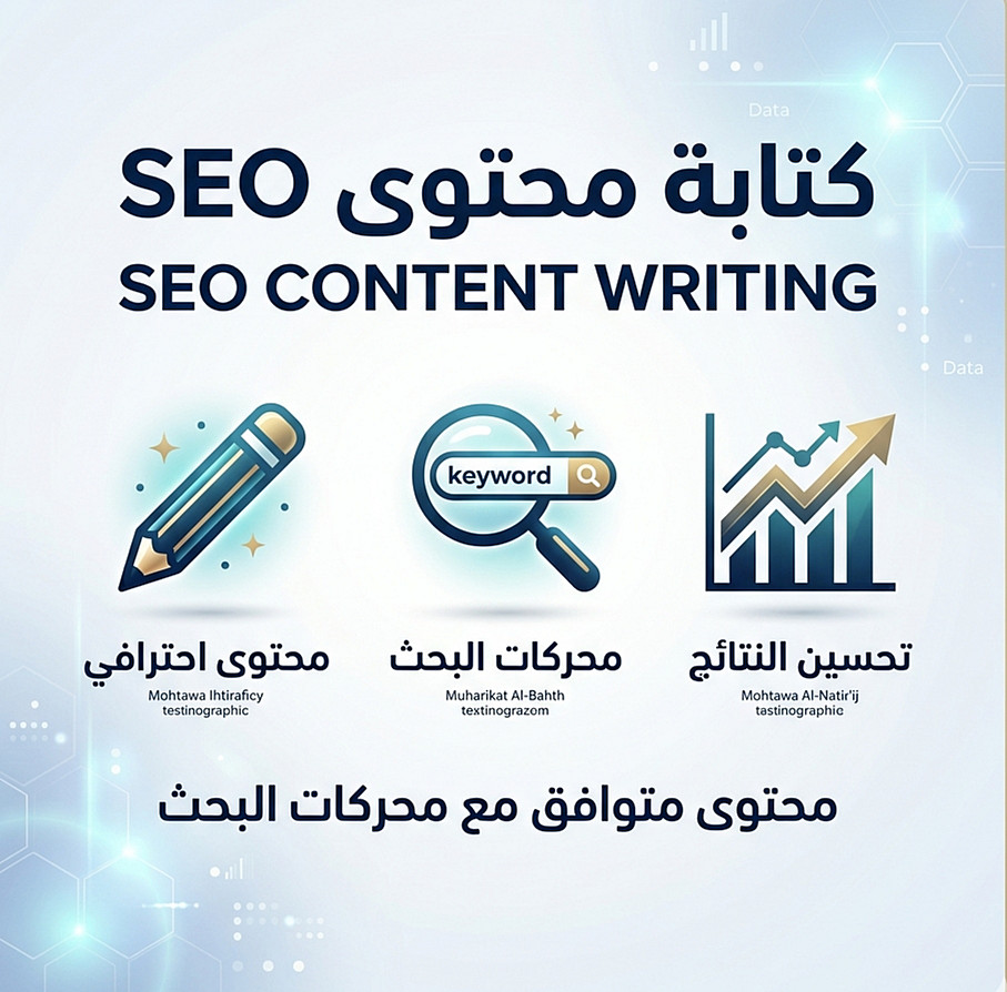 أقدّم خدمة كتابة محتوى SEO احترافي مبني على تحليل الكلمات المفتاحية وفهم نية المستخدم، مع صياغة مقالات وصفحات منتجات وصفحات هبوط متوافقة مع محركات البحث.