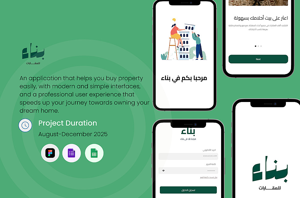 هل تبحث عن تصميم يجمع بين الأناقة العملية والسهولة المتناهية لمشروعك العقاري القادم؟ أقدم لك خدمة تصميم واجهات مستخدم احترافية لتطبيق "بناء" للعقارات، حيث قمت بالتركيز على خلق تجربة مستخدم سلسة تساعد الباحث عن العقار في الوصول لهدفه بأقل عدد من النقرات.