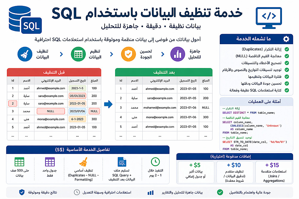 أقدم خدمة احترافية لتنظيف ومعالجة البيانات باستخدام SQL وتحويلها إلى بيانات دقيقة وجاهزة للتحليل