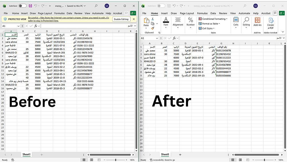 -إزالة المسافات الزائدة ومعالجة الخلايا الفارغة
