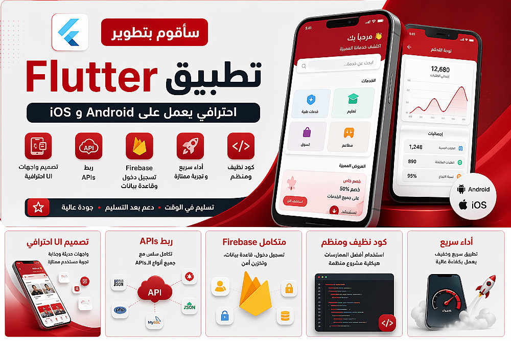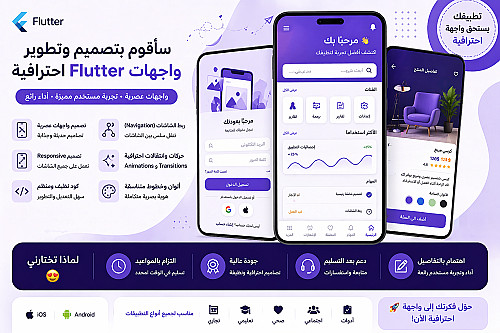 سأقوم بتطوير تطبيق باستخدام Flutter يعمل على Android و iOS بجودة عالية وتصميم حديث يناسب فكرتك.