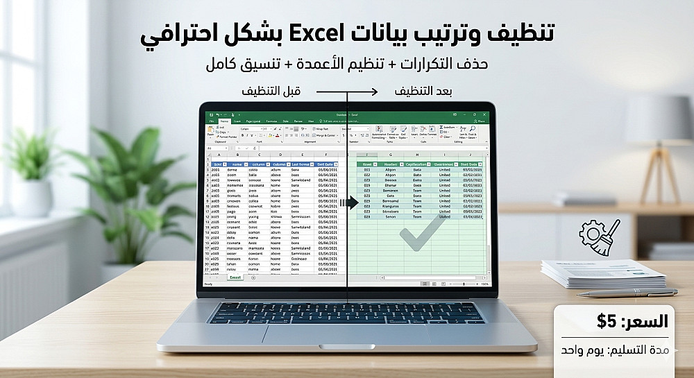 سأقوم بتنظيف وترتيب بياناتك في ملف Excel، وتشمل الخدمة: