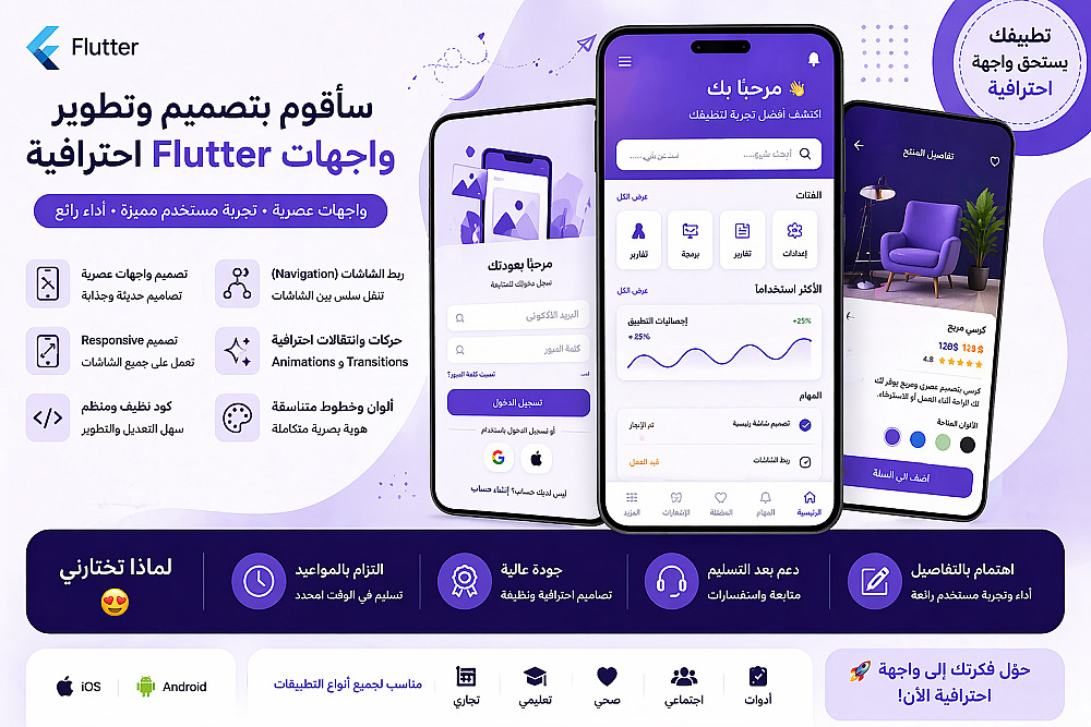 سأقوم بتصميم وتطوير واجهات Flutter حديثة وجذابة مع الاهتمام بتجربة المستخدم وسهولة الاستخدام، بحيث يظهر تطبيقك بشكل احترافي على Android و iOS.