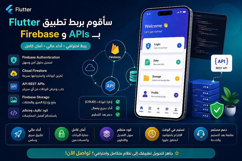 سأقوم بربط تطبيق Flutter الخاص بك بـ Firebase و APIs بشكل احترافي مع ضمان الأداء العالي والأمان.