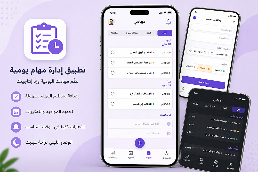 تطبيق لإدارة وتنظيم المهام اليومية، يسمح بإضافة مهام، تحديد مواعيد، وتفعيل الوضع الليلي.