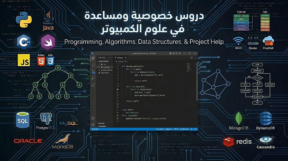 أقدم لك خدمة الشرح والتبسيط لمواد تخصص علوم الحاسب والمجالات التقنية. أعتمد في الشرح على الفهم العميق وبناء التفكير المنطقي السليم لربط النظريات بالتطبيق العملي، مما يساعدك على اجتياز اختباراتك وإنجاز مشاريعك بكفاءة عالية بعيداً عن الحفظ التلقيني.