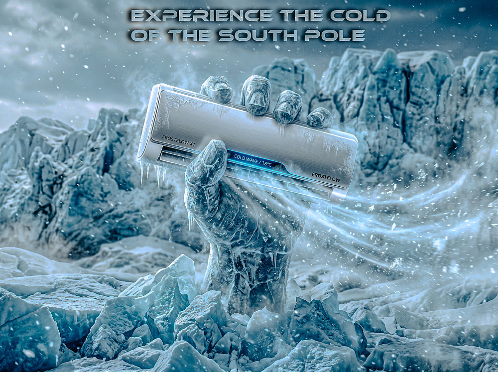 تصميم إعلان إبداعي لمكيف هواء بأسلوب سينمائي يجسد قوة التبريد في بيئة جليدية