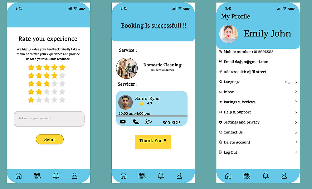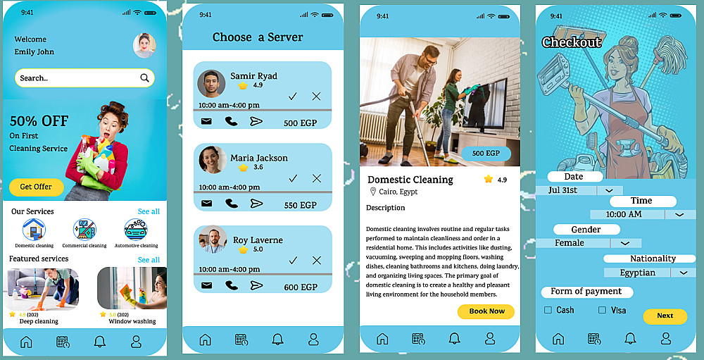 وكمان هصمّم 4 صفحات إضافية بنفس الأسلوب والشكل، علشان يكون في تناسق وهوية موحدة بين كل صفحات الموقع أو التطبيق.