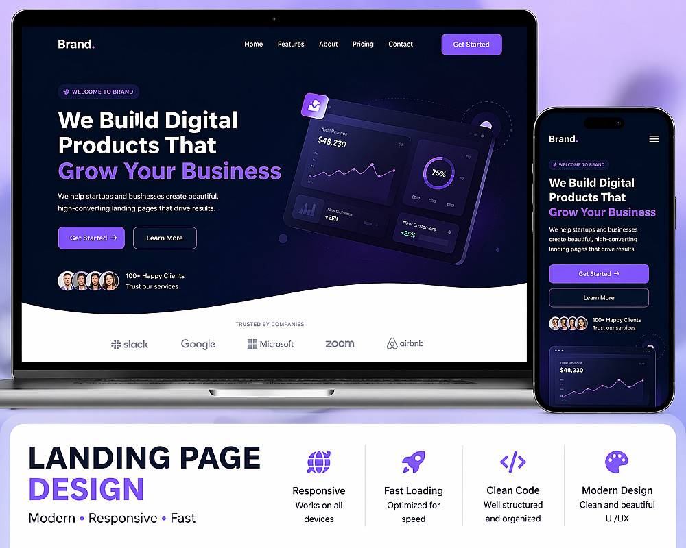 أقدم خدمة تصميم Landing Page حديثة ومتجاوبة باستخدام HTML, CSS, JavaScript، بتصميم عصري وكود نظيف وسهل التعديل.