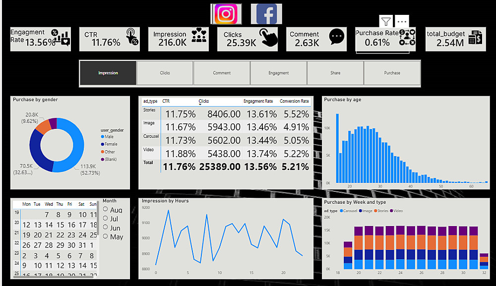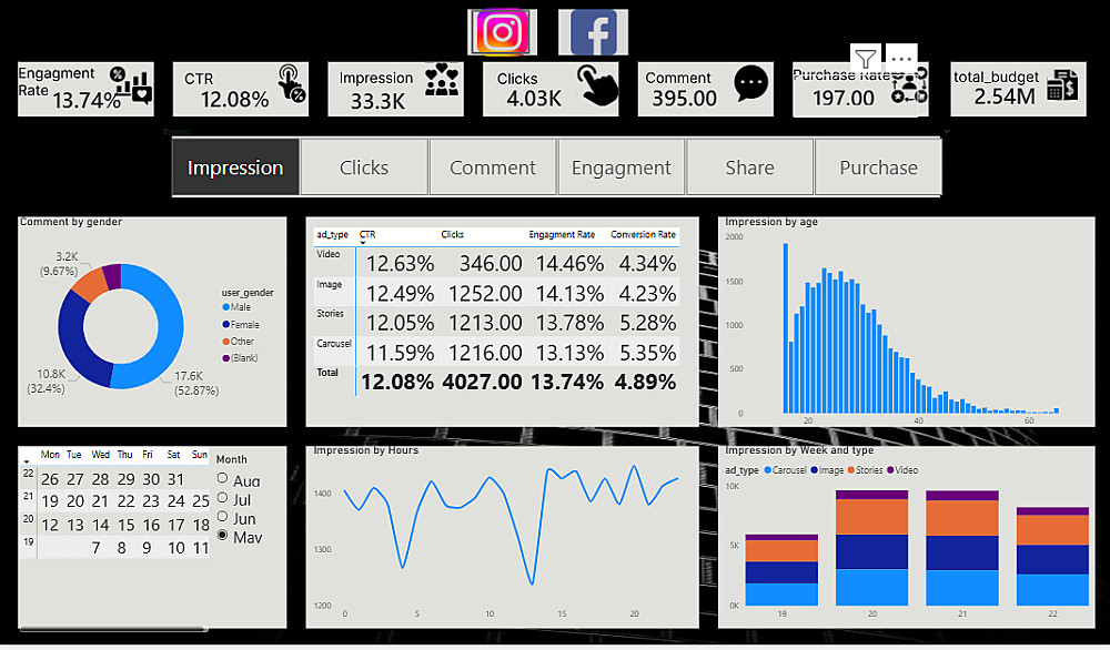 أصمّم لك لوحة تحكم تفاعلية تعرض أهم مؤشرات الأداء (CTR – Engagement – Impressions – Conversions) مع تحليل واضح لحملاتك على Instagram وFacebook.