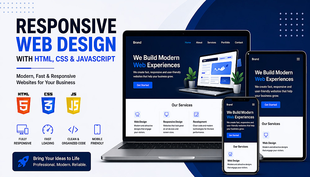 أقدم خدمة تصميم وتطوير مواقع ويب باستخدام HTML, CSS, JavaScript بأسلوب حديث يركز على الأداء وسهولة الاستخدام، أقوم بتحويل فكرتك إلى موقع منظم وسريع ومتجاوب مع جميع الشاشات (موبايل، تابلت، كمبيوتر)، مع كتابة كود نظيف يسهل تعديله لاحقًا.
