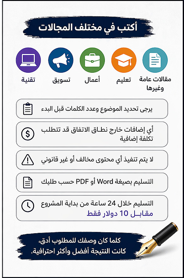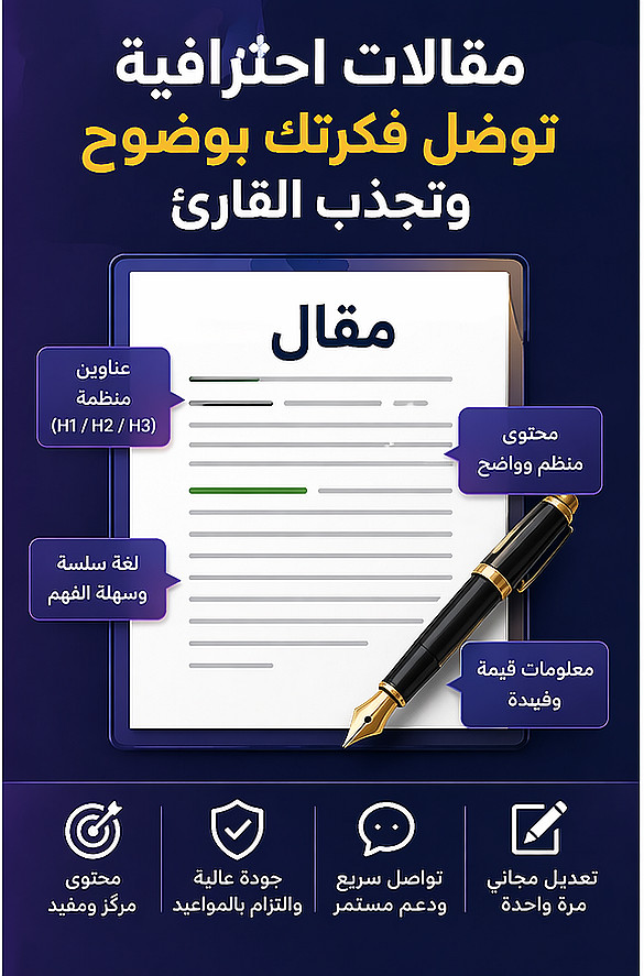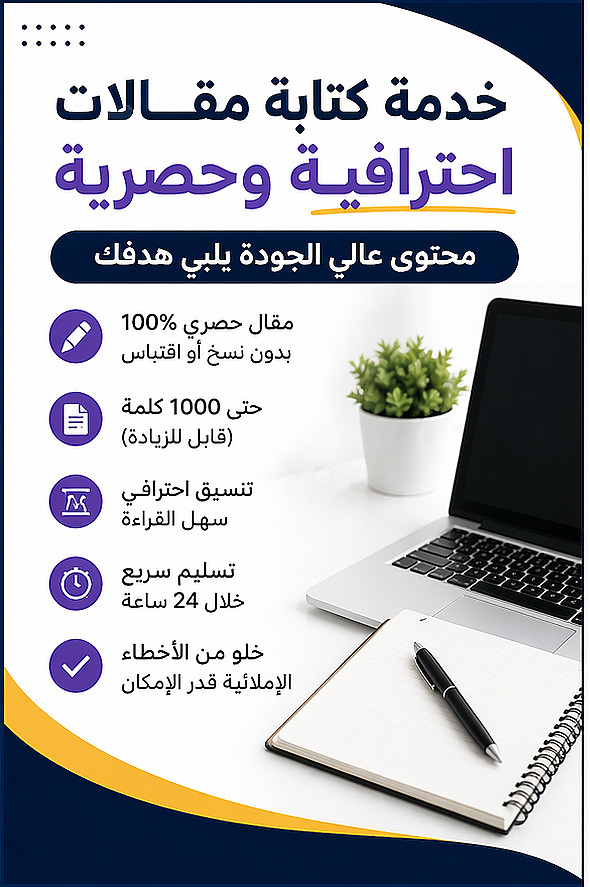 أقدّم لك خدمة كتابة مقالات حصرية 100% تساعدك على عرض أفكارك بوضوح وبأسلوب احترافي يجذب القارئ.