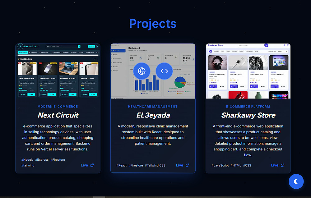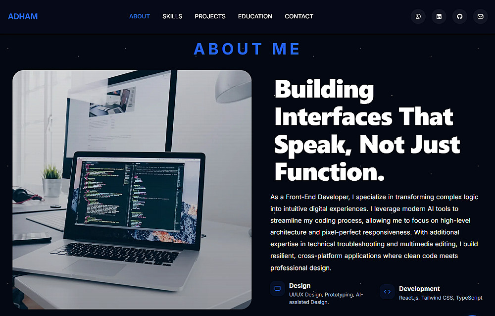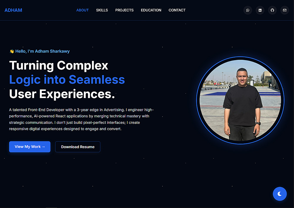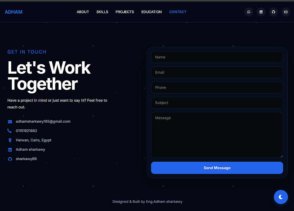 - اتصل بي (Contact Me): نموذج تواصل أو روابط مباشرة (WhatsApp, LinkedIn, GitHub, email).