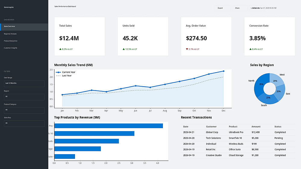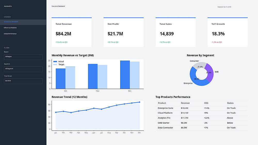 أقوم بجمع وتحليل بياناتك ثم تحويلها إلى Dashboards مرئية احترافية تعرض أهم مؤشرات الأداء (KPIs) بطريقة بسيطة ومنظمة وسهلة الفهم.