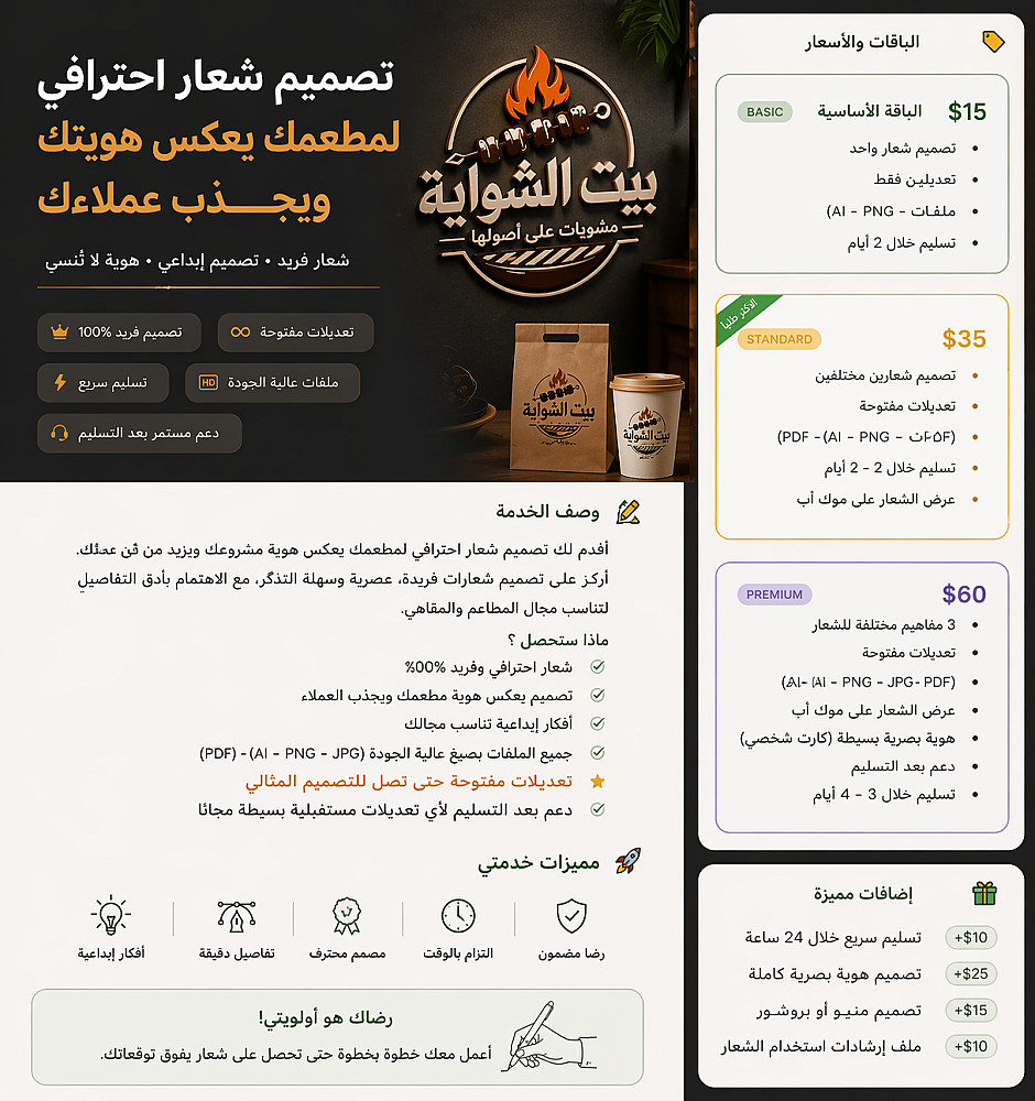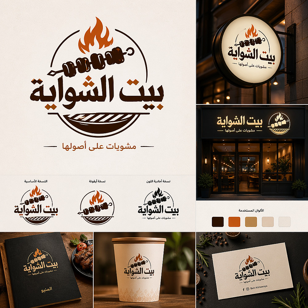 واقعية العرض (Mockups): لن أعطيك شعاراً على خلفية بيضاء فقط، بل سأريك كيف سيبدو على منتجاتك، لافتة محلك، ومنيو مطعمك كما في الصور.