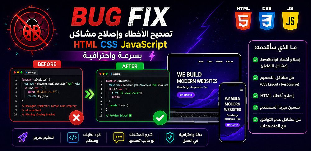 تصحيح الأخطاء وإصلاح مشاكل مواقع HTML CSS JavaScript بسرعة واحترافية 🟢 وصف الخدمة: