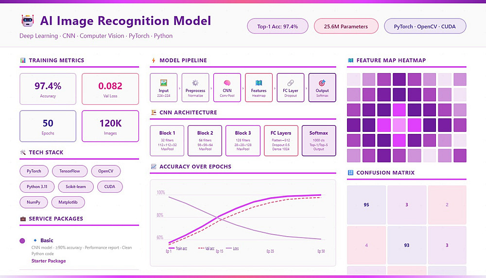 يتم تطوير نموذج ذكاء اصطناعي مخصص للتعرف على البيانات المطلوبة بدقة وكفاءة، مما يساعد على أتمتة عملية التحليل واستخلاص النتائج بشكل سريع. تشمل الخدمة تجهيز البيانات، تنظيفها، ومعالجتها لتكون مناسبة لبناء النموذج، مع دعم ملفات حتى 200 ميجابايت وأنواع مثل CSV وExcel وPython.