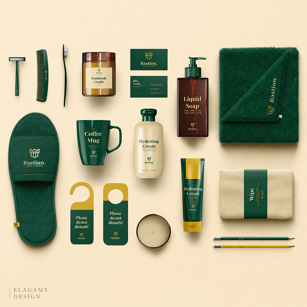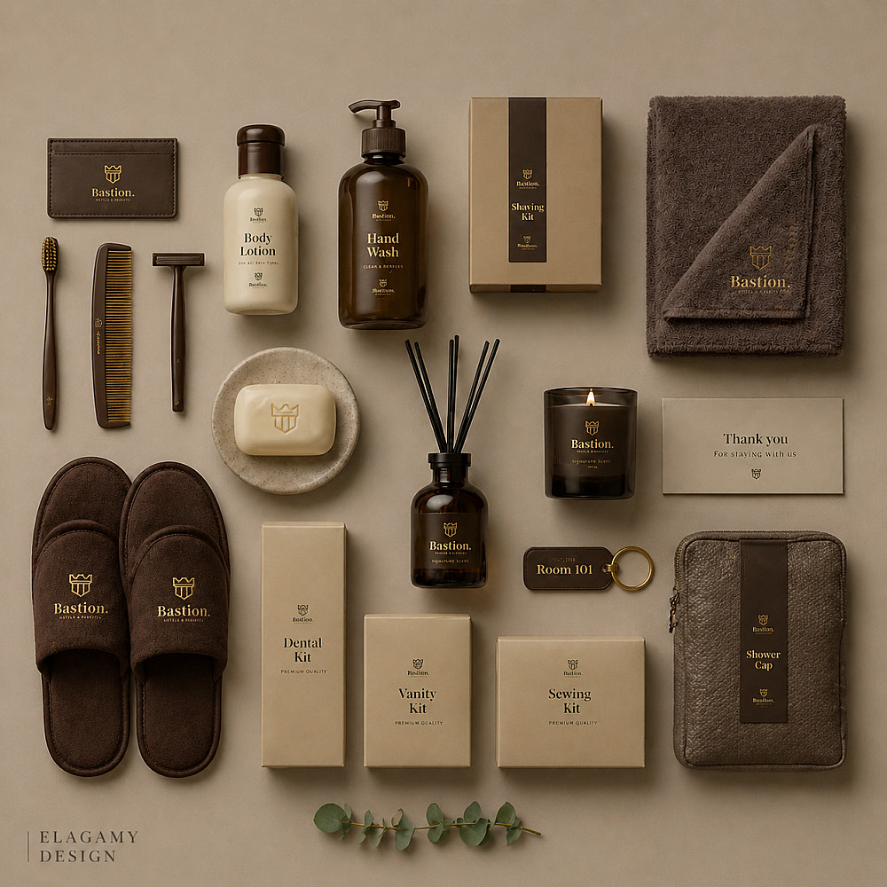 * **إخراج المنتجات (Mockups):** عرض شعارك على عبوات، زجاجات، أدوات مكتبية، أو مستلزمات فنادق بطريقة سينمائية.