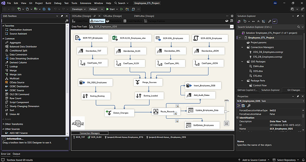 معالجة الأخطاء، حذف التكرار، وتصميم "مستودع بيانات" (Data Warehouse) منظم.