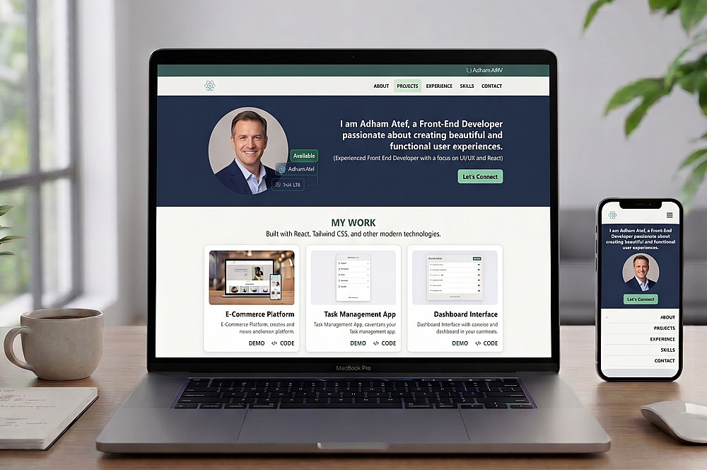 أنا أدهم عاطف، مطوّر ويب Full-Stack، أقدّم لك خدمة إنشاء موقع بورتفوليو احترافي يعرض أعمالك بشكل منظم ويعكس مهاراتك بشكل مميز.