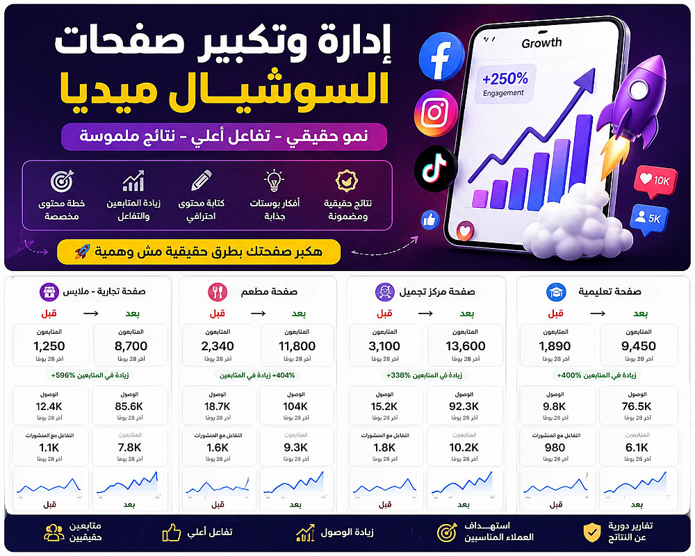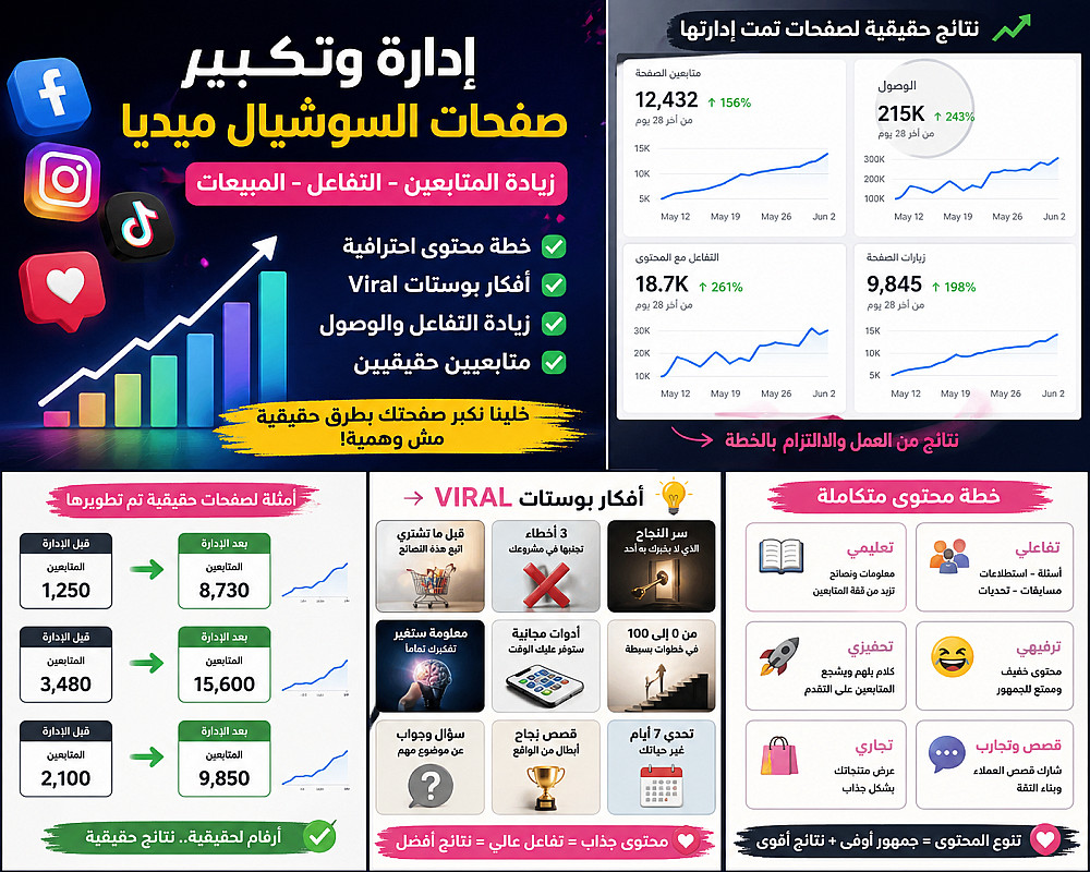 أقدم لك خدمة إدارة وتكبير صفحات السوشيال ميديا بطريقة احترافية لزيادة التفاعل والمتابعين الحقيقيين وتحسين ظهور نشاطك.