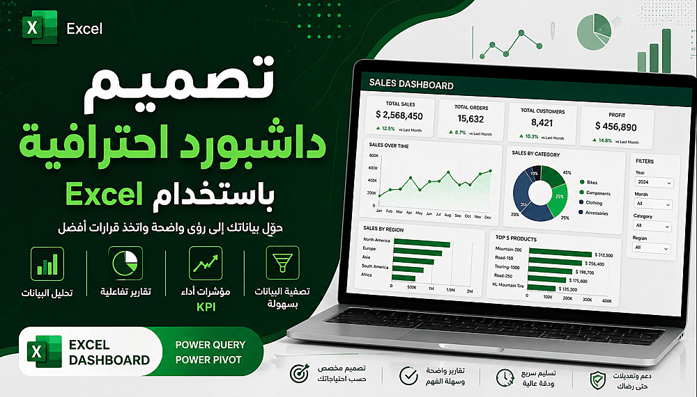سأقوم بتصميم Dashboard احترافية وتفاعلية باستخدام Excel لتحليل بياناتك وعرض مؤشرات الأداء بشكل واضح واحترافي.