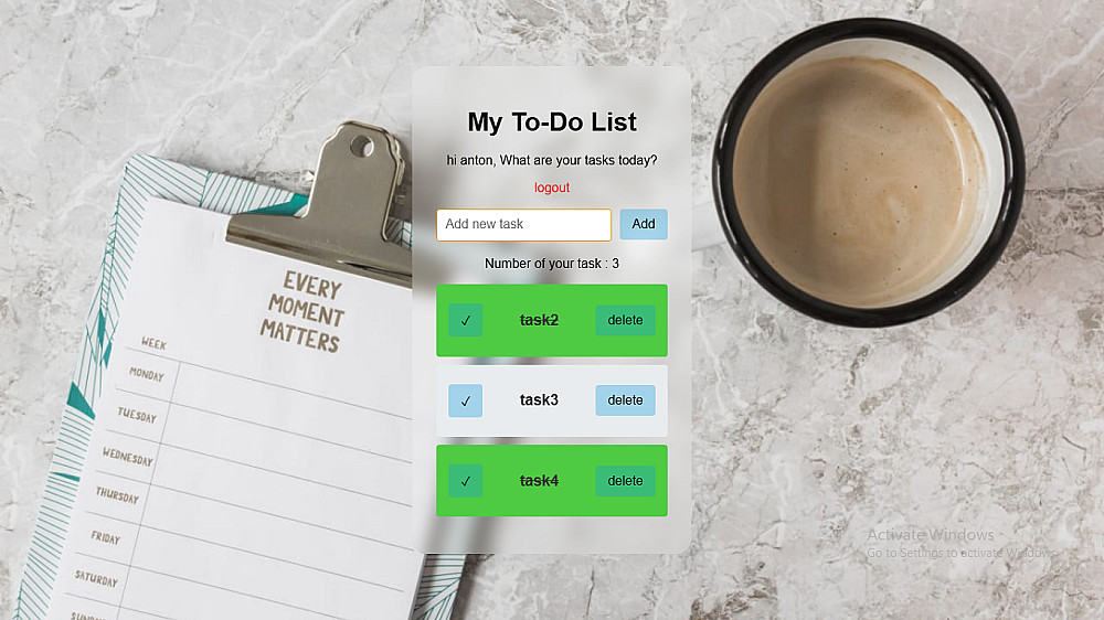 بعد تسجيل الدخول، يتم توجيه المستخدم مباشرة إلى لوحة المهام الخاصة به، حيث يمكنه إدارة جميع مهامه بشكل بسيط ومنظم.