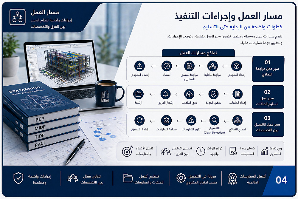 أقدم خدمة إعداد وتنظيم حزمة معايير وإجراءات البيم قابلة للتطبيق على المشاريع، وتشمل إعداد مستندات ومعايير واضحة لتنظيم العمل بين الفرق والتخصصات.