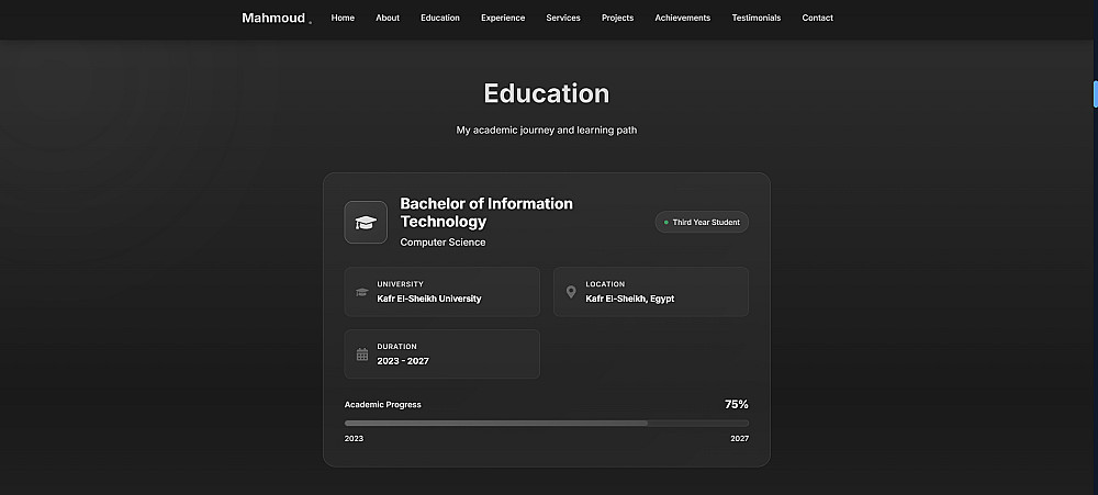 أقدم لك خدمة تصميم وتطوير موقع بورتفوليو شخصي احترافي باستخدام تقنيات HTML وCSS وJavaScript، مع تصميم عصري وأنيق يعكس هويتك المهنية ويترك انطباعاً لا يُنسى.