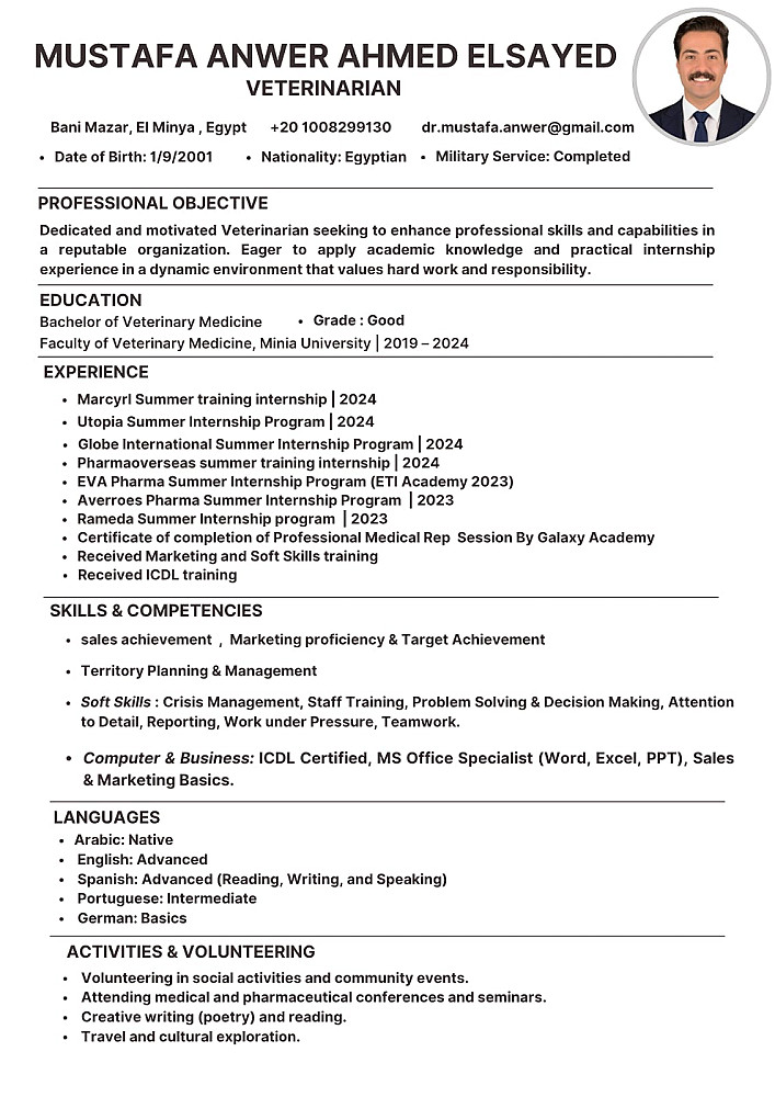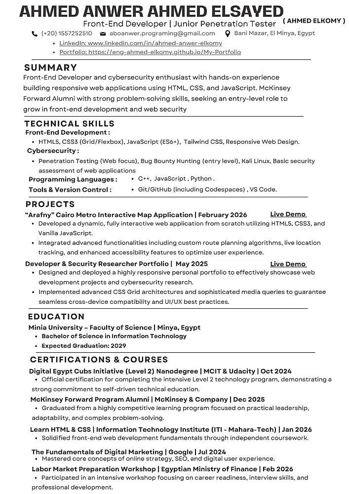أقدّم لك خدمة تصميم سيرة ذاتية احترافية متوافقة مع أنظمة تتبع المتقدمين (ATS)، مما يزيد من فرص قبولك في الوظائف واجتياز الفحص الأولي بسهولة.