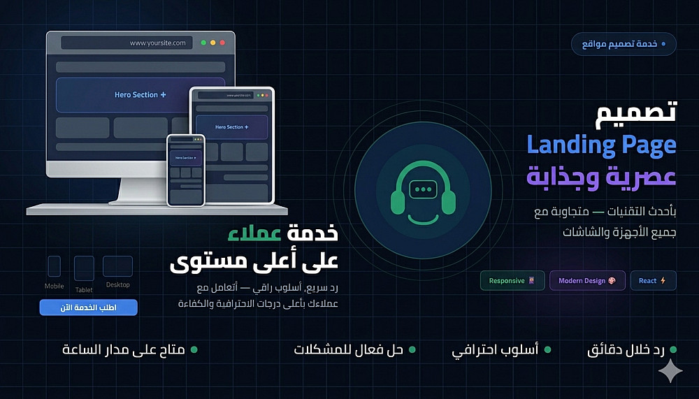 أقدّم لك تصميم صفحة هبوط (Landing Page) عصرية وسريعة، مصممة بعناية لتوفر تجربة مستخدم مميزة، وتعمل بكفاءة على جميع الأجهزة (الكمبيوتر – الهاتف – التابلت)، باستخدام أحدث تقنيات الويب: HTML وCSS وJavaScript.