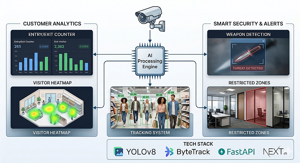 أقدم لك نظاماً متكاملاً يعتمد على تقنيات الذكاء الاصطناعي (AI) و الرؤية الحاسوبية (Computer Vision)، مصمم خصيصاً للمحلات التجارية، المولات، والمخازن. يقوم النظام بمعالجة البث المباشر لحظياً لتحويل الفيديو الخام إلى تقارير وإحصائيات دقيقة وتنبيهات أمنية فورية.