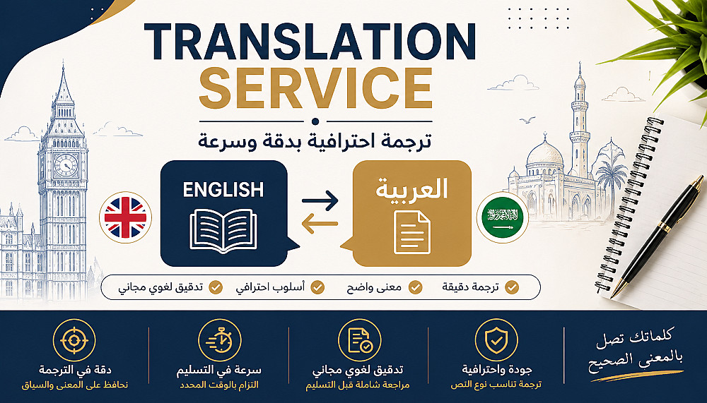 أقدم لك خدمة ترجمة احترافية من الإنجليزية إلى العربية والعكس، بدقة عالية وأسلوب لغوي سليم يحافظ على المعنى الأصلي للنص بدون أخطاء.