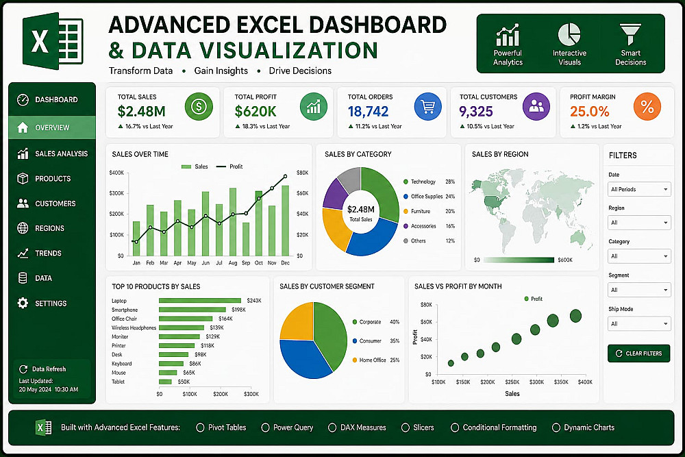 يمكنني مساعدتك في تصميم Dashboard احترافي باستخدام Excel يحول بياناتك إلى تقارير مرئية (Visual) تساعدك على متابعة الأداء واتخاذ قرارات أفضل.