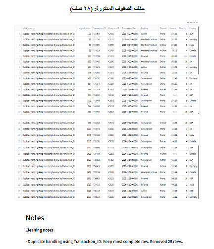 إذا كانت لديك ملفات Excel أو CSV أو Google Sheets أو بيانات مُصدّرة من نظام ERP أو CRM وتحتوي على تكرار، أخطاء، قيم ناقصة أو تنسيقات عشوائية، فأنا أقدّم لك خدمة تنظيف ومعالجة البيانات Data Cleaning and Processing لجعل بياناتك نظيفة، منظمة، وجاهزة للتحليل أو الربط مع Power BI ولوحات المتابعة.