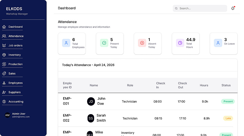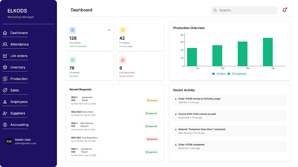 أقدم لك تصميم واجهات حديثة ومتكاملة لنظام إدارة الورش يساعدك على تنظيم العمل، متابعة الطلبات، وإدارة العملاء والعمليات اليومية بسهولة وكفاءة.