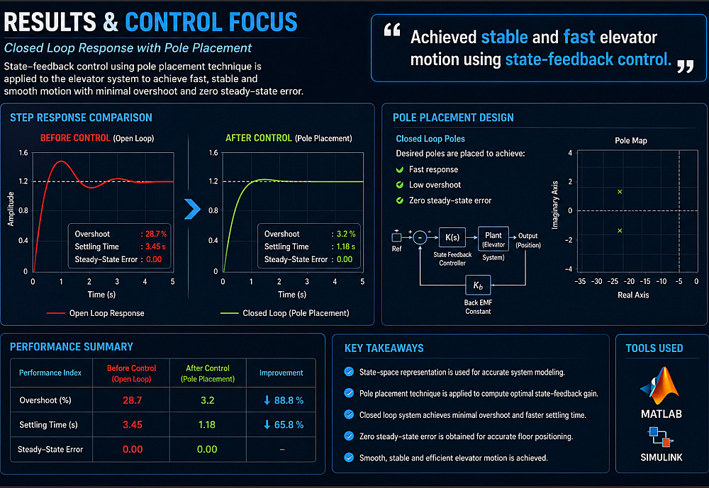 تم تطبيق نمذجة الحالة (State Space) وتصميم نظام تحكم باستخدام تقنية Pole Placement لضمان استقرار النظام ودقة التحكم.