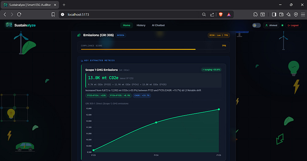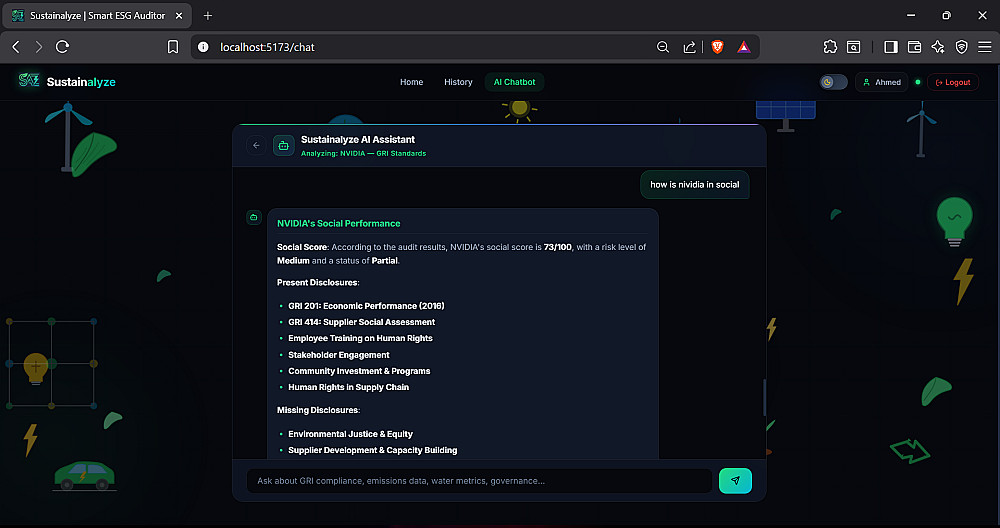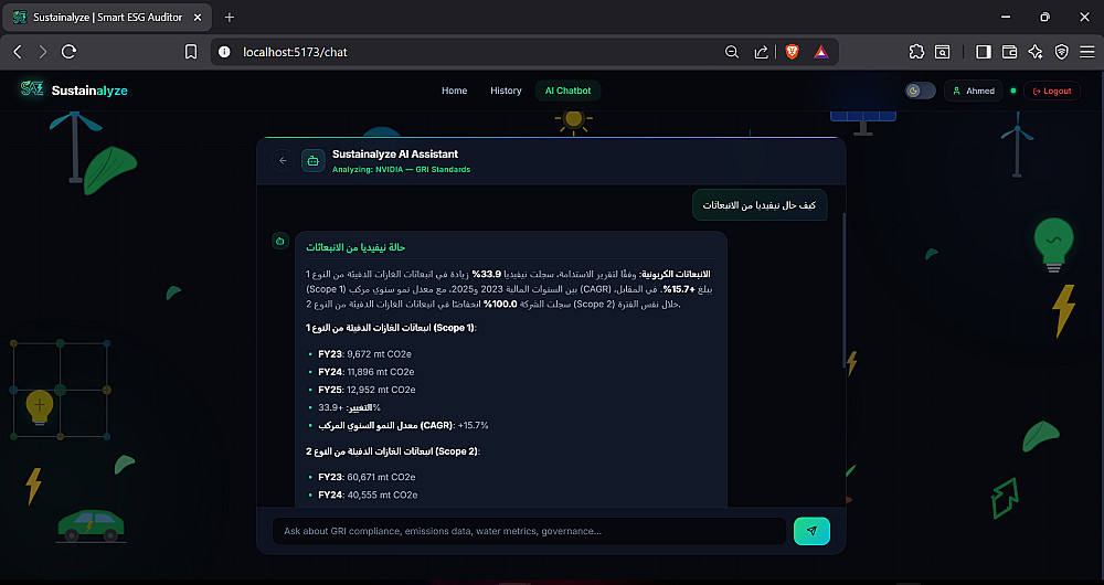 قراءة وتحليل المستندات المعقدة: استخراج الأرقام والبيانات بدقة عالية من ملفات الـ PDF (كما هو موضح في صور الخدمة لمنصة Sustainalyze التي تقوم بتحليل تقارير الاستدامة آلياً).