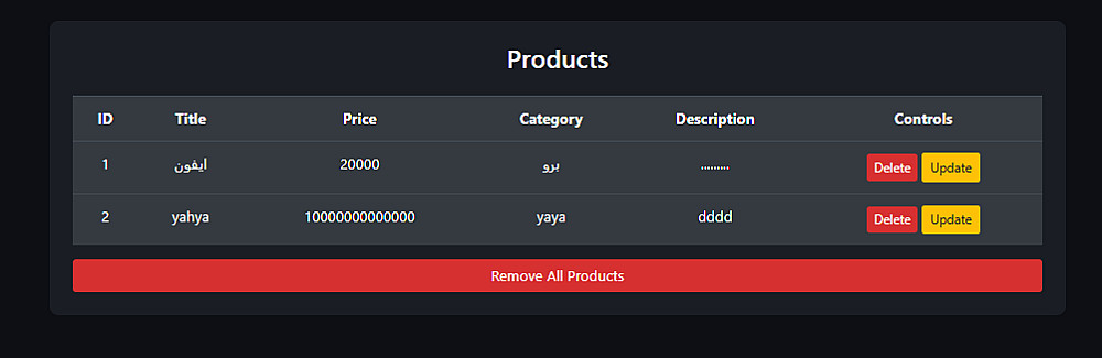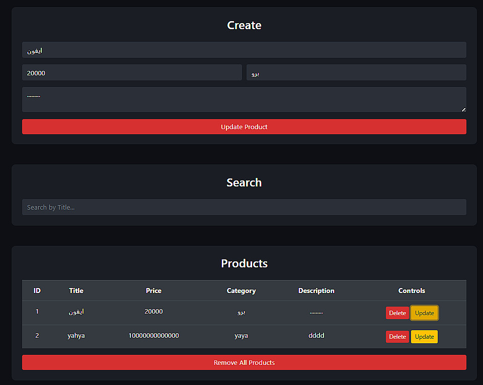 أقدم خدمة تصميم نظام إدارة بيانات (CRUD) تفاعلي باستخدام JavaScript، مناسب لإدارة المنتجات أو أي نوع بيانات بسهولة من خلال واجهة بسيطة وسريعة.