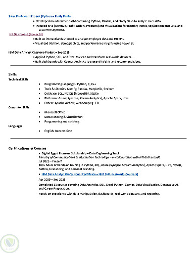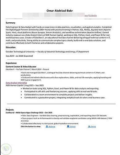متخصص في علوم البيانات (Data Science) وخبير في إعداد السير الذاتية المهنية. بفضل خلفيتي التقنية، أساعد الباحثين عن عمل في تحويل خبراتهم إلى سير ذاتية احترا ....