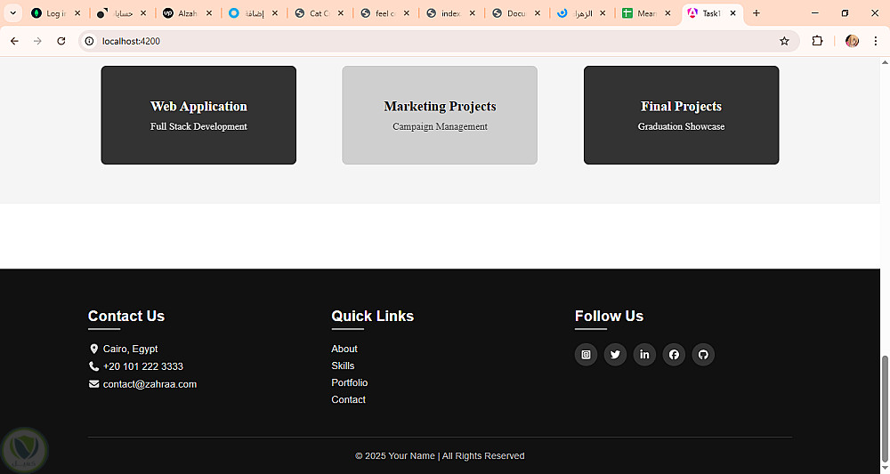 بناء تذييل شامل يضم معلومات الاتصال، روابط سريعة للتنقل داخل الموقع، ومنصات التواصل الاجتماعي.
