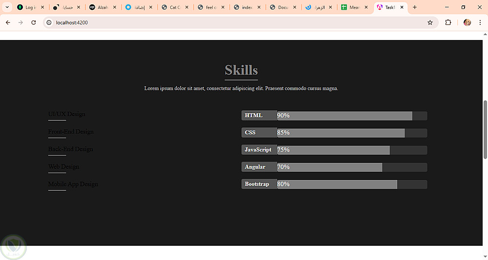 تنفيذ قسم "المهارات" الديناميكي (Skills) باستخدام أشرطة تقدم (Progress Bars) لتحديد مستوى الإتقان في التقنيات الأساسية (HTML, CSS, JavaScript, Angular, Bootstrap).