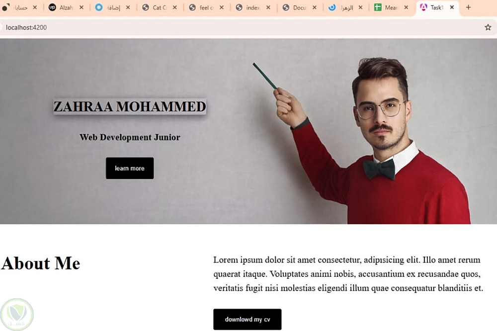 تطوير صفحة رئيسية تعرض الهوية المهنية (Web Development Junior) ونبذة شخصية مع خيار تنزيل السيرة الذاتية (CV).