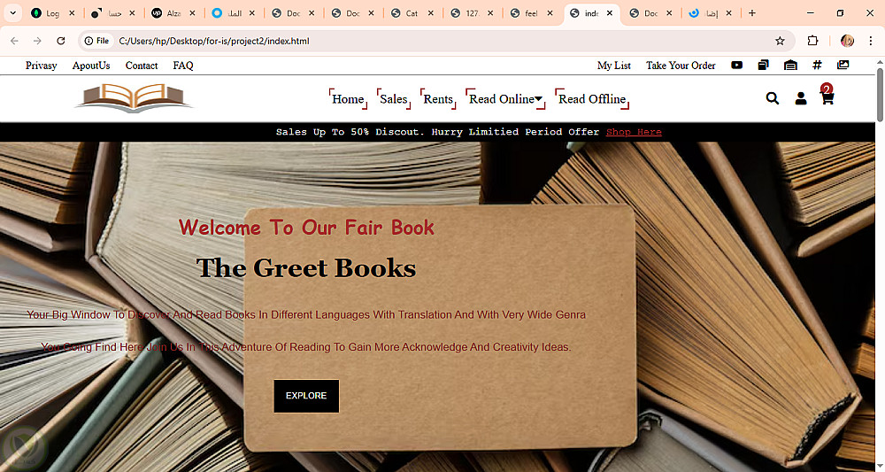 الهدف: تصميم واجهة أمامية (Frontend) لمنصة شاملة تتيح بيع وتأجير الكتب المطبوعة والرقمية، مع التركيز على الكتب متعددة اللغات.
