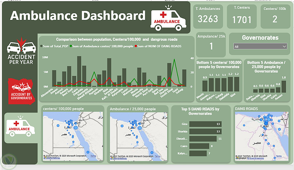 في هذا المشروع قمت بتنظيف البيانات وبناء نموذج بيانات متكامل يربط بين عدد سيارات ومراكز الإسعاف والكثافة السكانية والطرق الخطرة. أنشأت مقاييس DAX لحساب مؤشرات مثل سيارات الإسعاف لكل 25 ألف شخص ومراكز الإسعاف لكل 100 ألف، وصممت خرائط تفاعلية ولوحة مقارنة شاملة بين المحافظات.