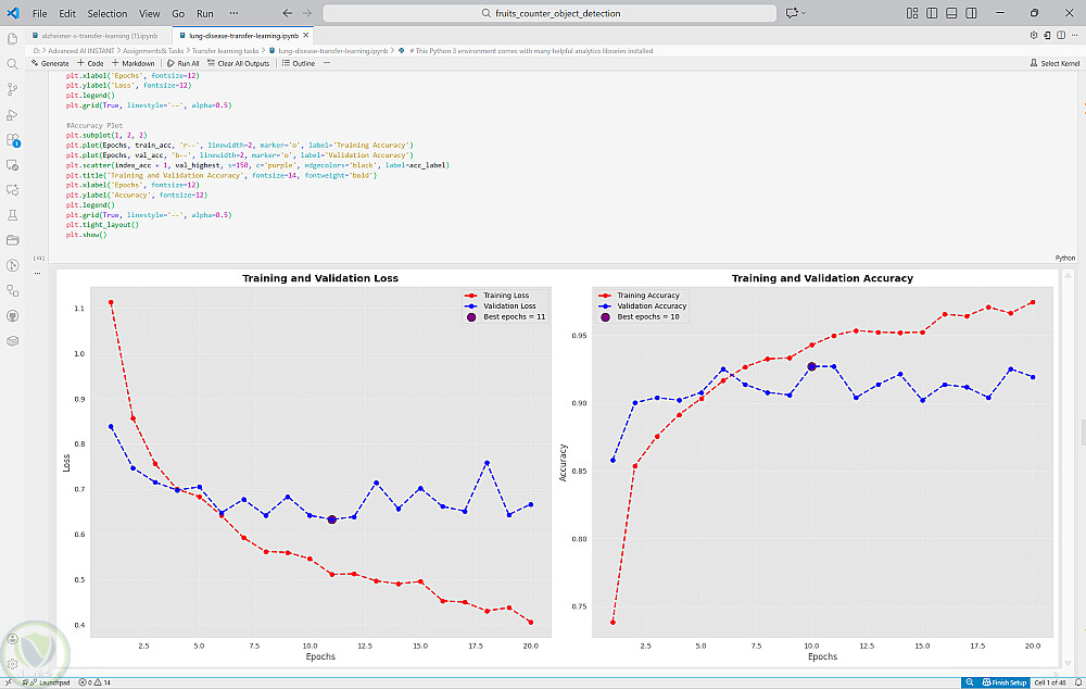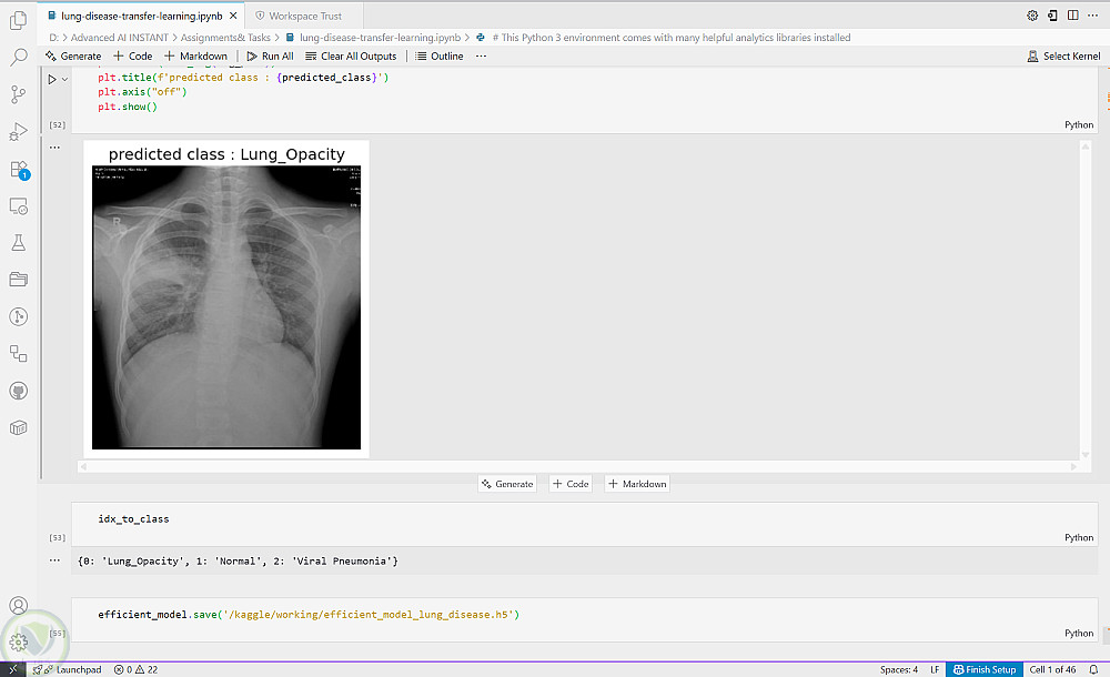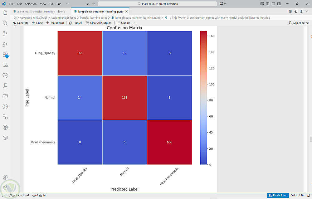 قمت بتطوير مشروع يعتمد على التعلم العميق والتعلم بالنقل لتصنيف صور أشعة الرئة إلى ثلاث فئات: Lung Opacity، Viral Pneumonia، Normal. بدأت بإعداد البيانات عبر إنشاء DataFrame لمسارات الصور وتصنيفاتها، ثم تقسيمها إلى Train وValidation وTest، مع تطبيق Data Augmentation لزيادة تنوع العينات وتحسين الأداء. عرضت عينات من الصور لفهم طبيعتها قبل التدريب.