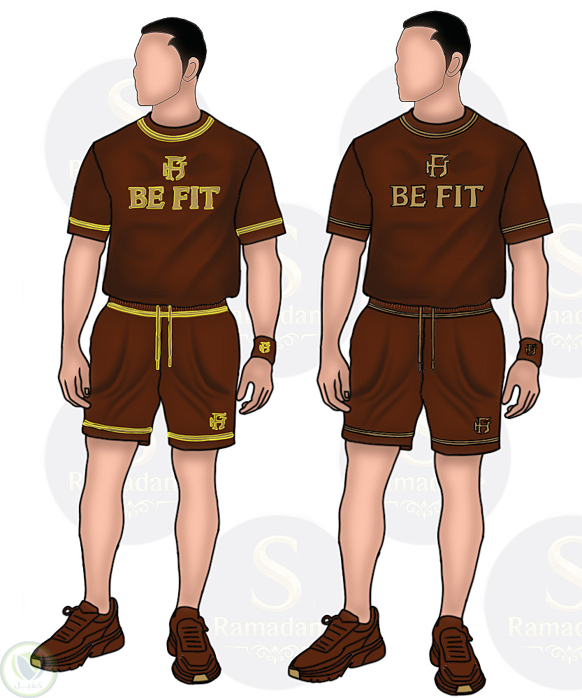 تصميم طقم رياضي رجالي متكامل بتفاصيل دقيقة وجودة عالية، يتكوّن من تيشيرت وشورت بلون بني أنيق مع لمسات ذهبية مُترفة تمنح إحساسًا بالفخامة والقوة.