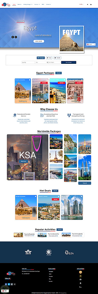 موقع سياحي متكامل بواجهة جذابة وسهلة الاستخدام، يعرض أهم العروض والباقات بصور واضحة. كل باكدج له صفحة احترافية تشمل المدن، مدة الرحلة، الخدمات، السعر، والصور. يقدر العميل يبحث ويستخدم فلاتر حسب البلد أو المدة أو السعر بسهولة، مع نظام حجز وتواصل مرن عبر البريد أو WhatsApp.